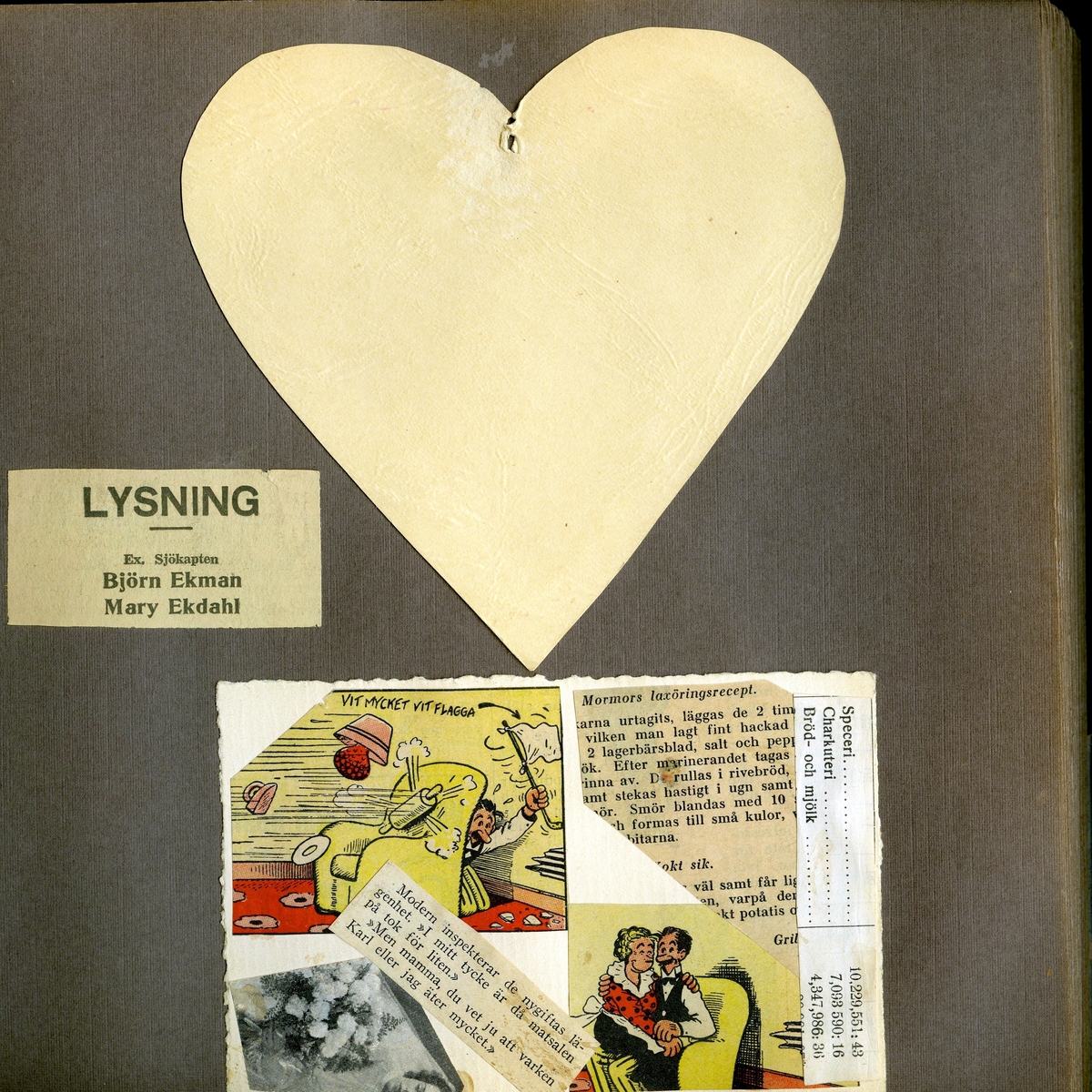 Lysning inför bröllopet mellan Mary Ekdahl (1920 - 1988, gift Ekman) och Björn Ekman (1913 - 1992) i Hagakyrkan i Göteborg 1941-06-07. Man ser ett urklippt ljusgult hjärta, lysningsannonsen samt ett axplock av små texter och bilder från serietidningar.