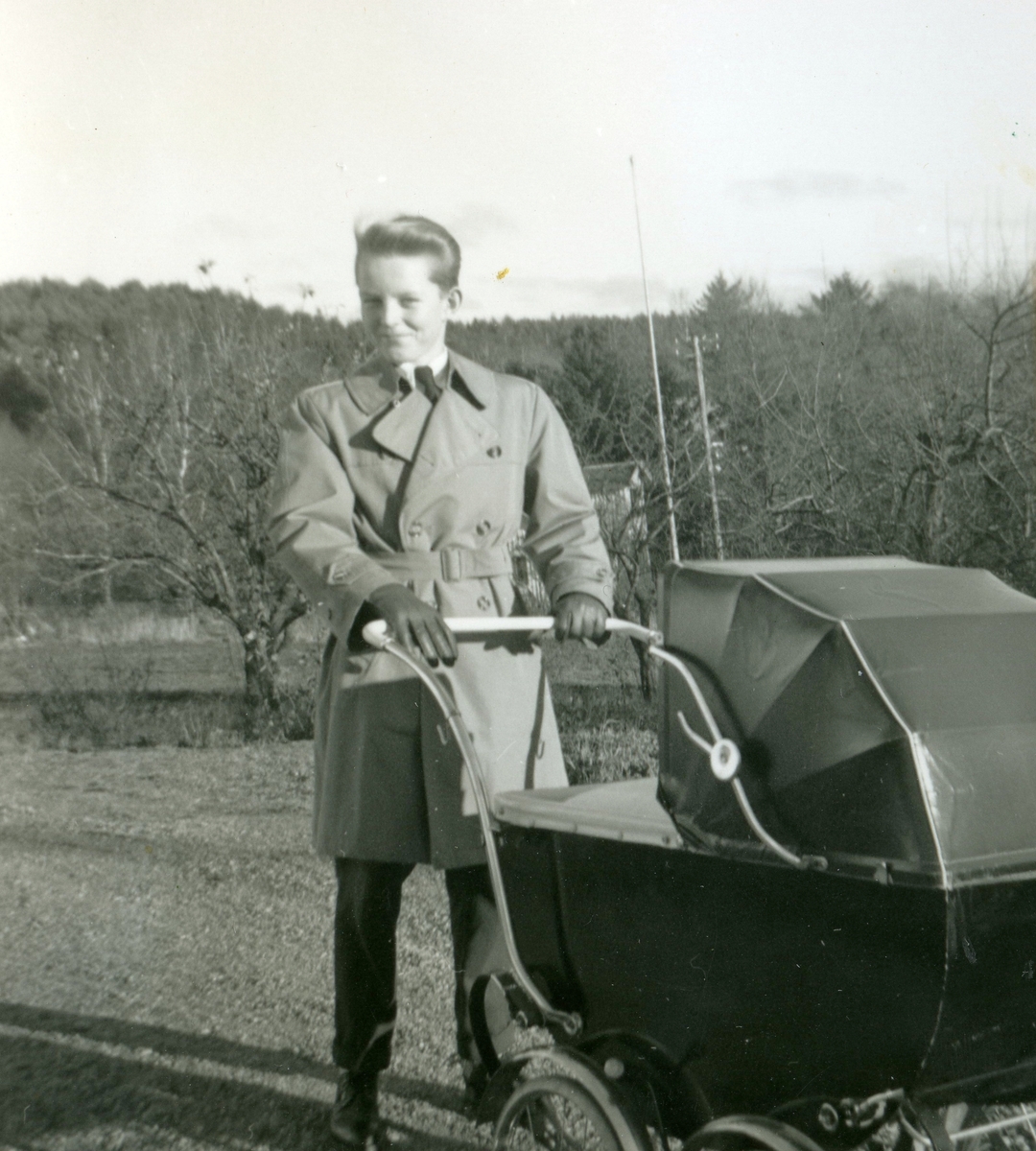 Hösten 1955 utanför Rothwalls hus på Streteredsvägen 31 i Kållered. Den stolta storebrodern "Uffen" (Ulf-Göran) Ekman kör barnvagnen med lille Manne liggandes i.