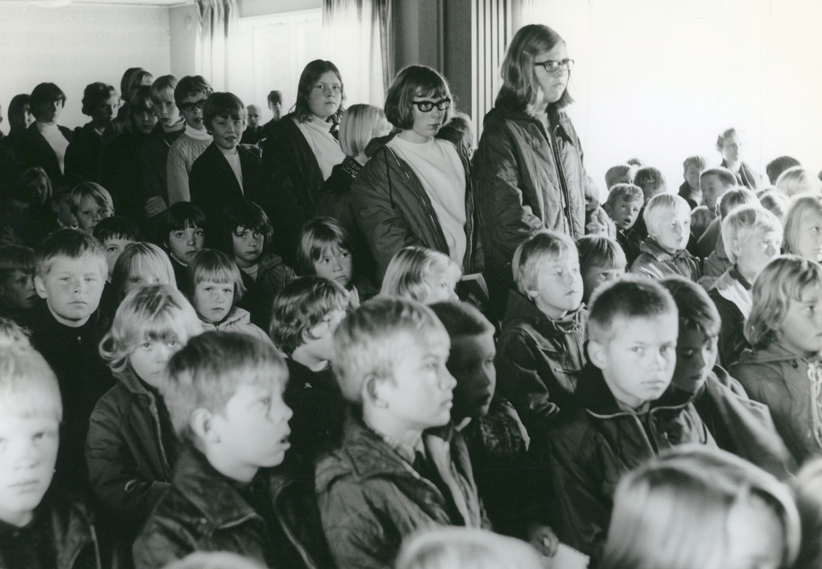 Besök i Kållereds skola (Brattåsskolan) i samband med Biskopsvisitationen år 1966. I bildens mitt ses bland annat Lena Lindgren, Solveig Andersson och Katarina Benkel (samtliga födda 1954).