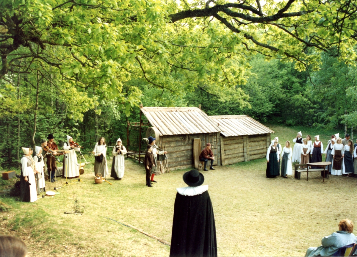 Första sommaren för Bygdespelet "Brandskatten", Ekansås i Kållered år 1987. Kvinnor, män och ungdomar är klädda i tidstypiska dräkter. Den svartklädda Prästen (bortvänd från kameran) spelas av Lisshammar. Enkla trästugor ses i bakgrunden.