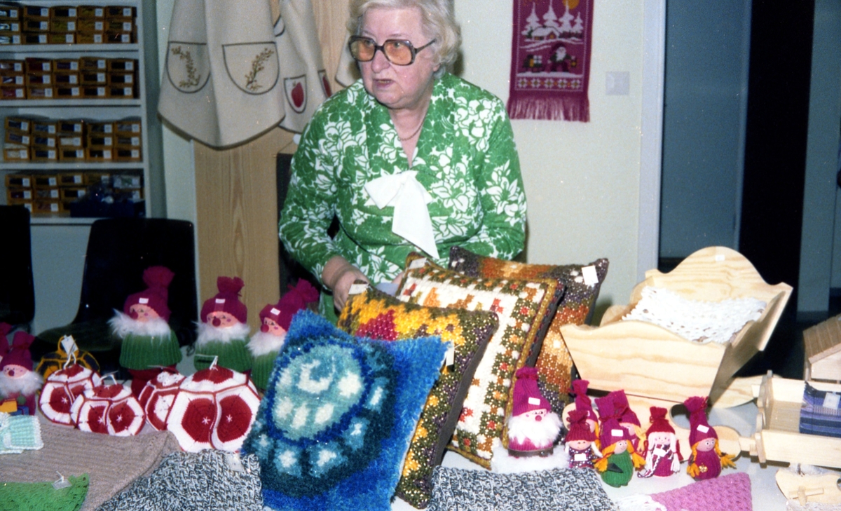Julförsäljning av hantverk i pensionärernas hobbylokal på Våmmedalsvägen år 1977. Berta Mattsson (1910 - 2013) står bakom ett bord. Berta arbetade i Centralköket på Stretereds skolhem. En av de första kvinnorna i Kållereds Kommunalfullmäktige och engagerad i Kållereds Socialdemokratiska kvinnoförening. Enligt uppgift älskade hon att väva mattor och baka goda ”Drömmar”.