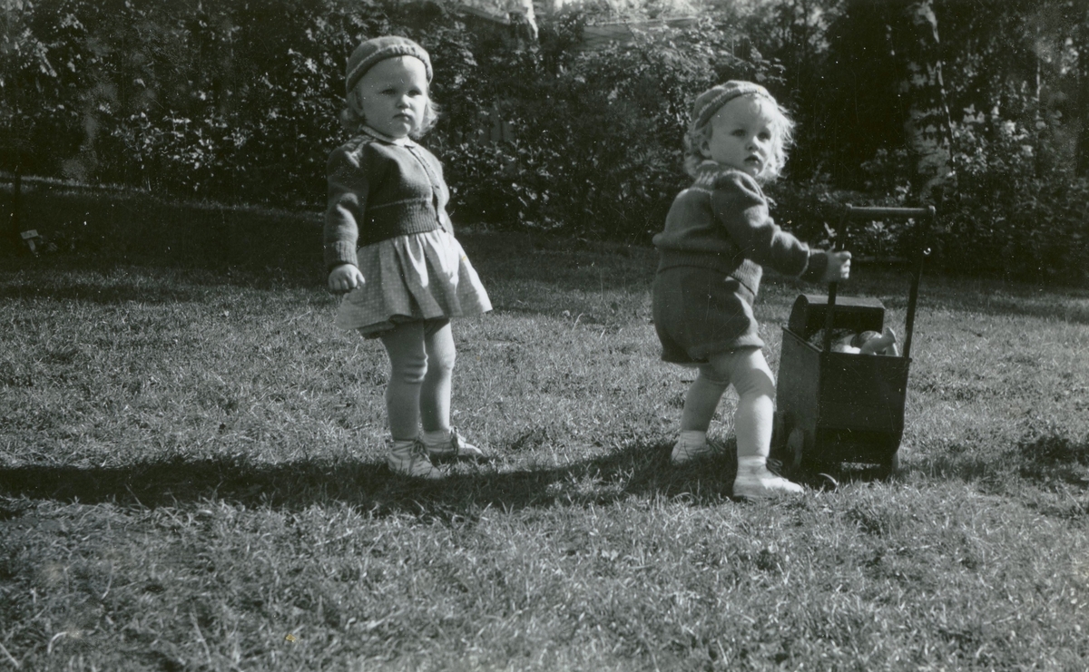 Syskonen Kjell (1945 - 1998) och Ann-Charlott Johansson leker med en dockvagn på en gräsmatta i Torrekulla år 1952. Barn till Allan och Margit Johansson. Allan arbetade som rättare vid flickhemmet i Torrekulla, där även Margit arbetade. De bodde i gamla huvudbyggnaden men byggde senare egen villa på Nyhagenvägen i Torrekulla. Relaterat motiv: A2355.