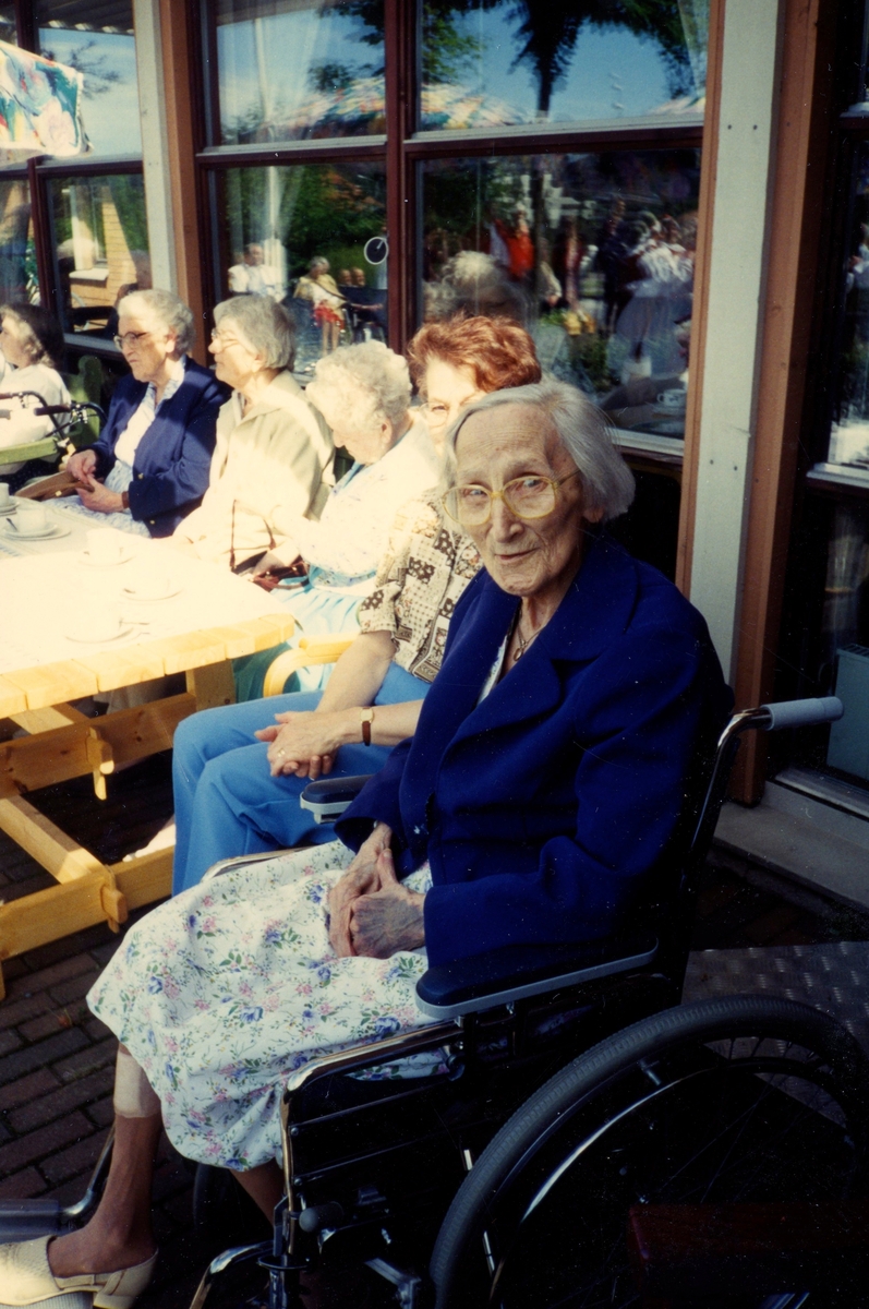 Fem kvinnor sitter och njuter av solen utanför Brattåsgården (Streteredsvägen 5), cirka 1990. Från vänster: (i glasögon, mörk jacka) Rut Göransson (1905 - 1999), Edit Bernhardsson (1911 - 2000), Maria Valvsten (1909 - 2004), vårdbiträde Agneta samt Sigrid Börjesson (1910 - 1995).