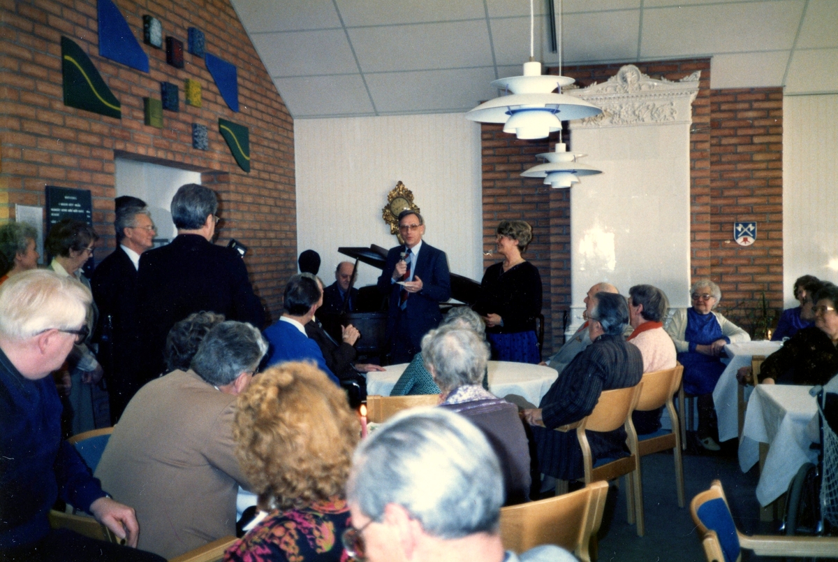 Musikunderhållning i Brattåsgårdens matsal (Streteredsvägen 5) år 1989. Vid flygeln sitter Rutger Milsta (från Lindome), vid mikrofonen står socialchef Bengt Alvekrans och till höger om honom står föreståndare Aina Ekstedt. I bakgrunden skymtar en kakelugn.