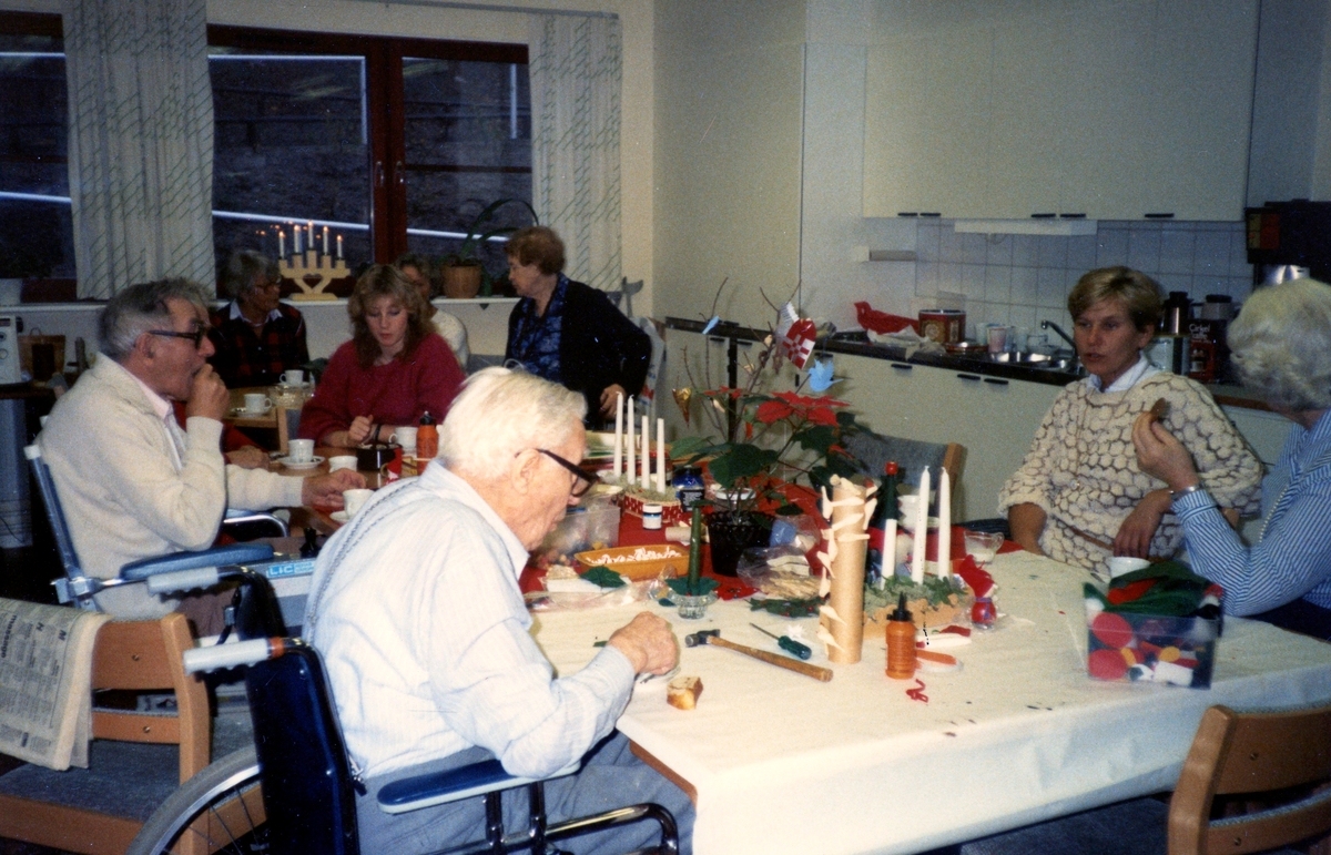 Brattåsgårdens hobbylokal cirka 1986 - 1990. Från vänster: 1. Einar Stjernberg (närmast kameran), 2. Knut Jerkfelt, 3. Edit Bernhardsson, 4. vårdbiträde Kristin Martinsson, 5. Maria Brattberg, 6. terapibiträde Ingela Bengtsson, 7. Okänd bortvänd.