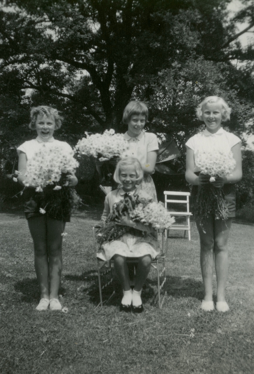 Fyra unga flickor med var sin bukett sitter/står i familjen Hedbergs trädgård i Torrekulla, år 1957. Stående från vänster: Monica Börjesson, Eva Pettersson (född 1944, gift Kempe) och Lena Börjesson. Sittande i mitten: Karin Pettersson (född 1947, gift Hansson). Systrarna var grannar på Gamlehagsvägen i Torrekulla.