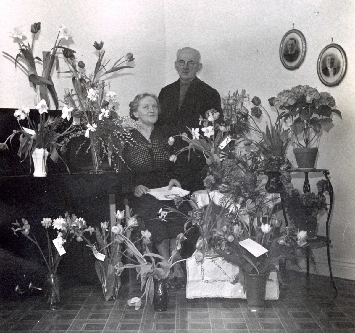 Judit Johansson fyller 60 år och uppvaktas med blomster i Vommedal Östergård "Olas" år 1953. Brevid står maken Gustav Johansson. Judit föddes 1893 i Bölet och Gustav föddes 1886 i Fässberg. De gifte sig 6/6 1917 och drev jordbruk i Vommedal.