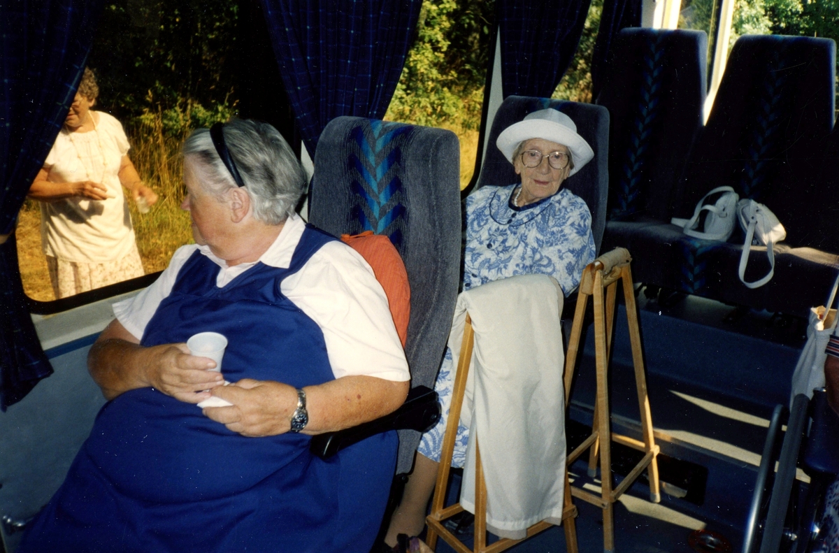 Brattåsgårdens äldreboende besöker Hembygdsgården Långåker i samband med cirkelavslutning*, cirka 1990 - 1995. Sittandes i bussen, från vänster: Monica Bergström och Jenny Nilson. Utanför bussen står Gördis Johansson.