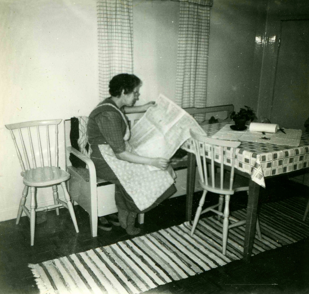 Margit Bengtsson (1901 - 1998) sitter och läser i sitt kök på första våningen i Heljered Sörgård "Skräddarns", 1950-tal. Margit och maken Erik brukade och ägde gården som senare revs. Sedan år 2013 ligger Heljereds förskola på platsen.