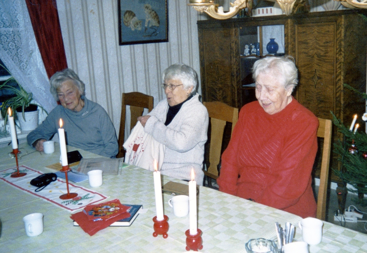 Julavslutning för Studieförbundet Vuxenskolans studiecirkel "Göteborg" i Vommedal Västergård 3:3 "Hanses" 5 december 2005. Från vänster: Stina Lundberg (1919 - 2016), ledare Eivor Bjerrhede (1921 - 2015) samt Karin Zackrisson (1917 - 2018).
