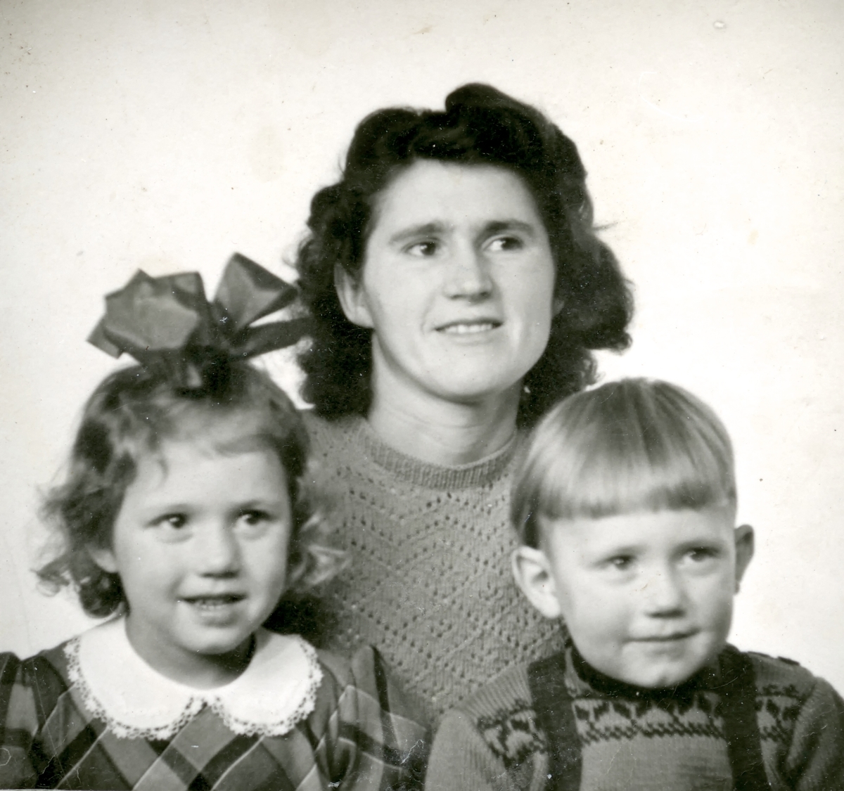 Familjeporträtt av Dagmar Svensson (1918 - 1996) med barnen Solveig (född 1942, gift Storfors) och Lennart (född 1944) år 1948. De bodde i Vommedal Västergård 3:2. Relaterat motiv: A2780.