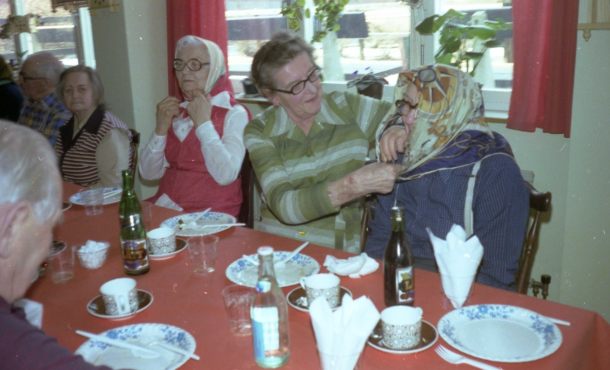 Påsklunch i Brattåsgårdens hobbylokal "Hobbyn" på Vommedalsvägen år 1979. Sittandes från vänster: 1. Okänd, 2. Alida Ekström, 3. Göta Stjärnberg och 4. Okänd. Hobbylokalen låg på Vommedalsvägen. Den flyttade 1986 till den då färdigställda Brattåsgården.