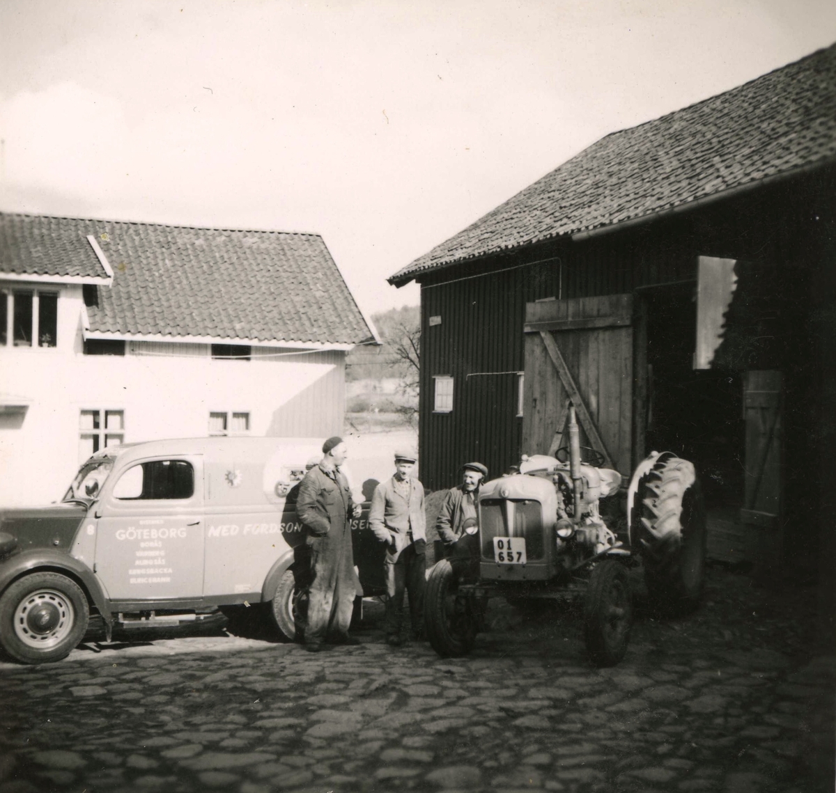 Gårdsplanen vid Ekans gård, Ekan 1:1, år 1953. Från vänster: traktorreparatör Malte. 2. Rolf Svensson (1909 - 1989), ägare av gården. 3. Robert Pettersson (1886 - 1968), dräng på gården sedan 1912. Relaterat motiv: A1149 och 1152.