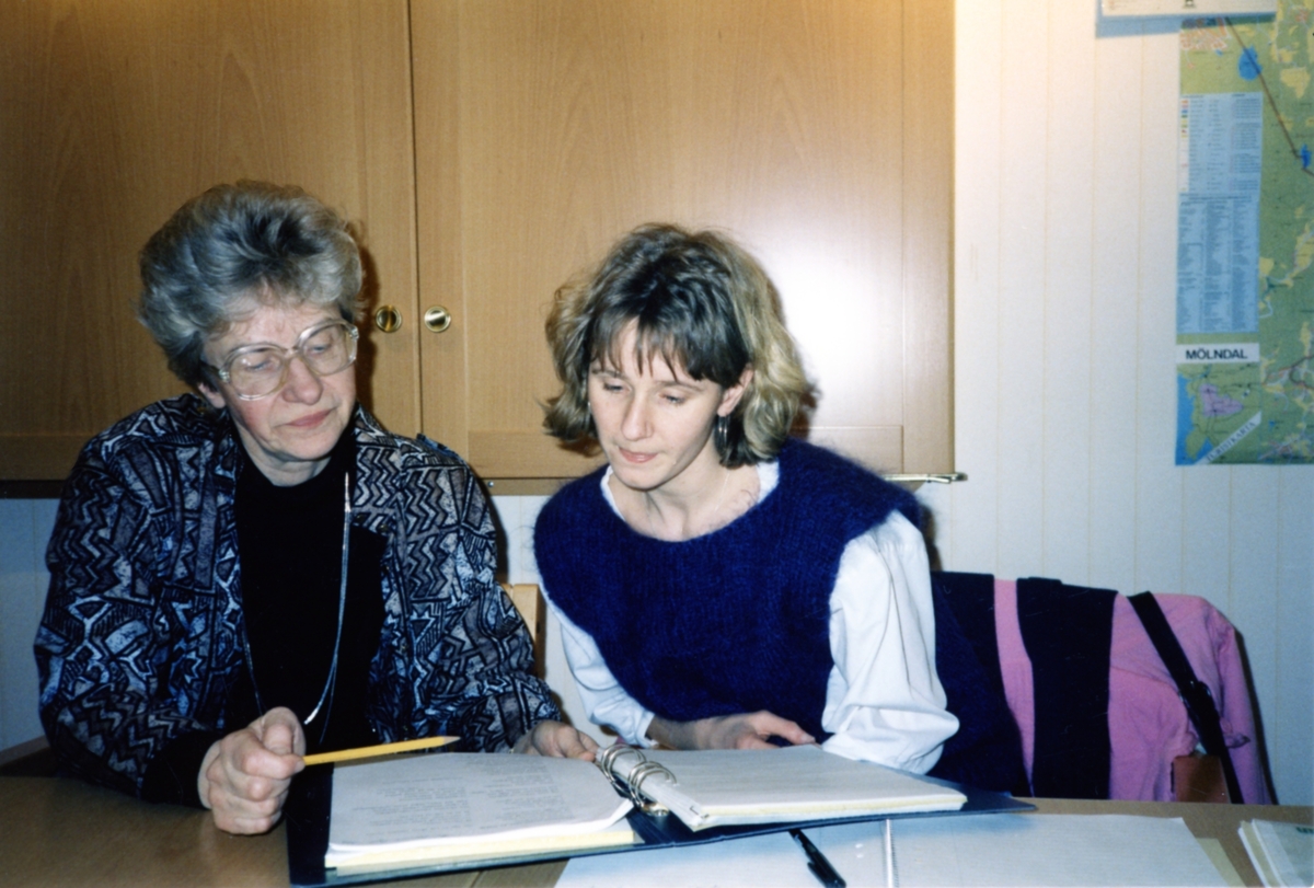 Brattåsgårdens studierum på Streteredsvägen 5 i Kållered cirka 1986/87. Från vänster: manusförfattare Märta Lindgren och projektledare Eva Ågren (SV Mölndal) sitter med förberedelser inför Bygdespelet "Brandskatten" som visades på Ekansås sommaren 1987.