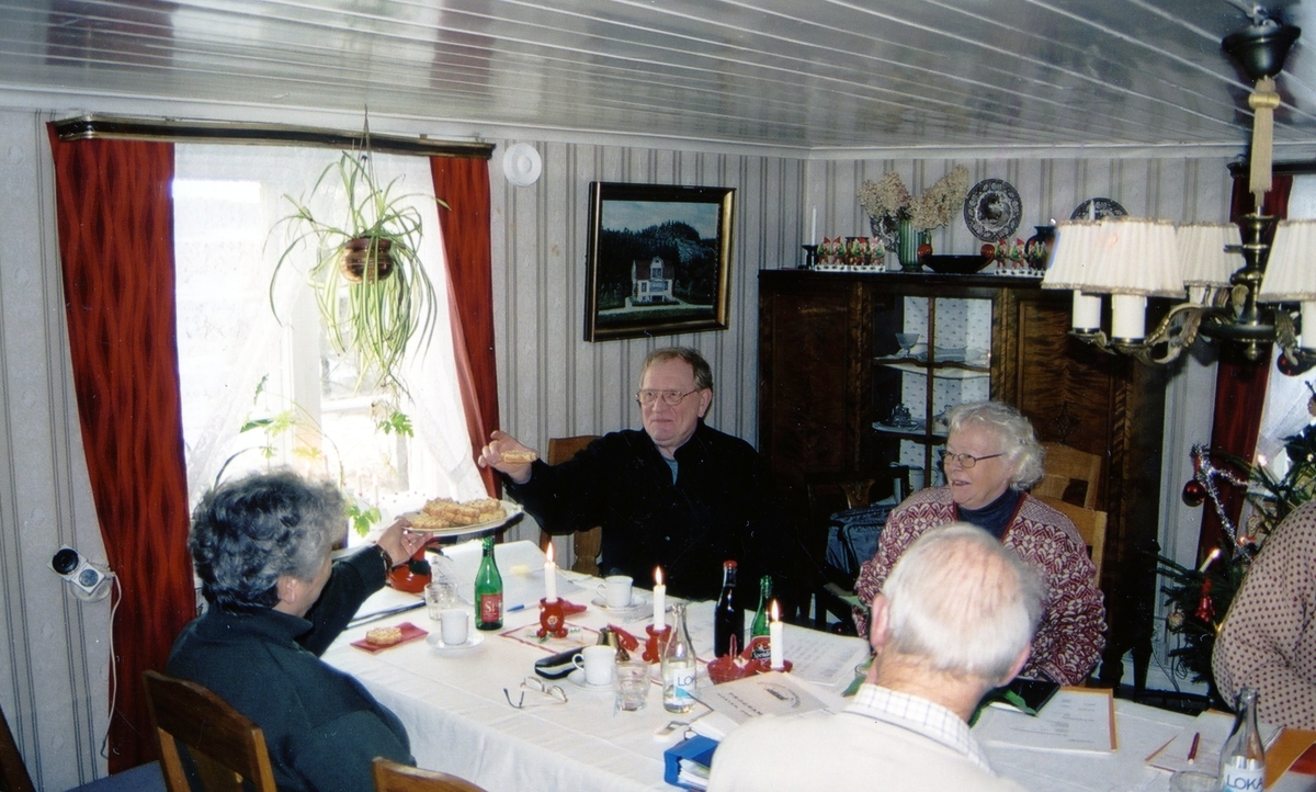 Styrelsemöte och julavslutning för Kållered Hembygdsgille i Vommedal Västergård, 1990-tal. Från vänster: Gun Flygare (ryggen mot kameran), Sune Ivarsson, Solvig Warvås, Manne Ekman (delvis skymd) och Rolf Bäckman (ryggen mot kameran).