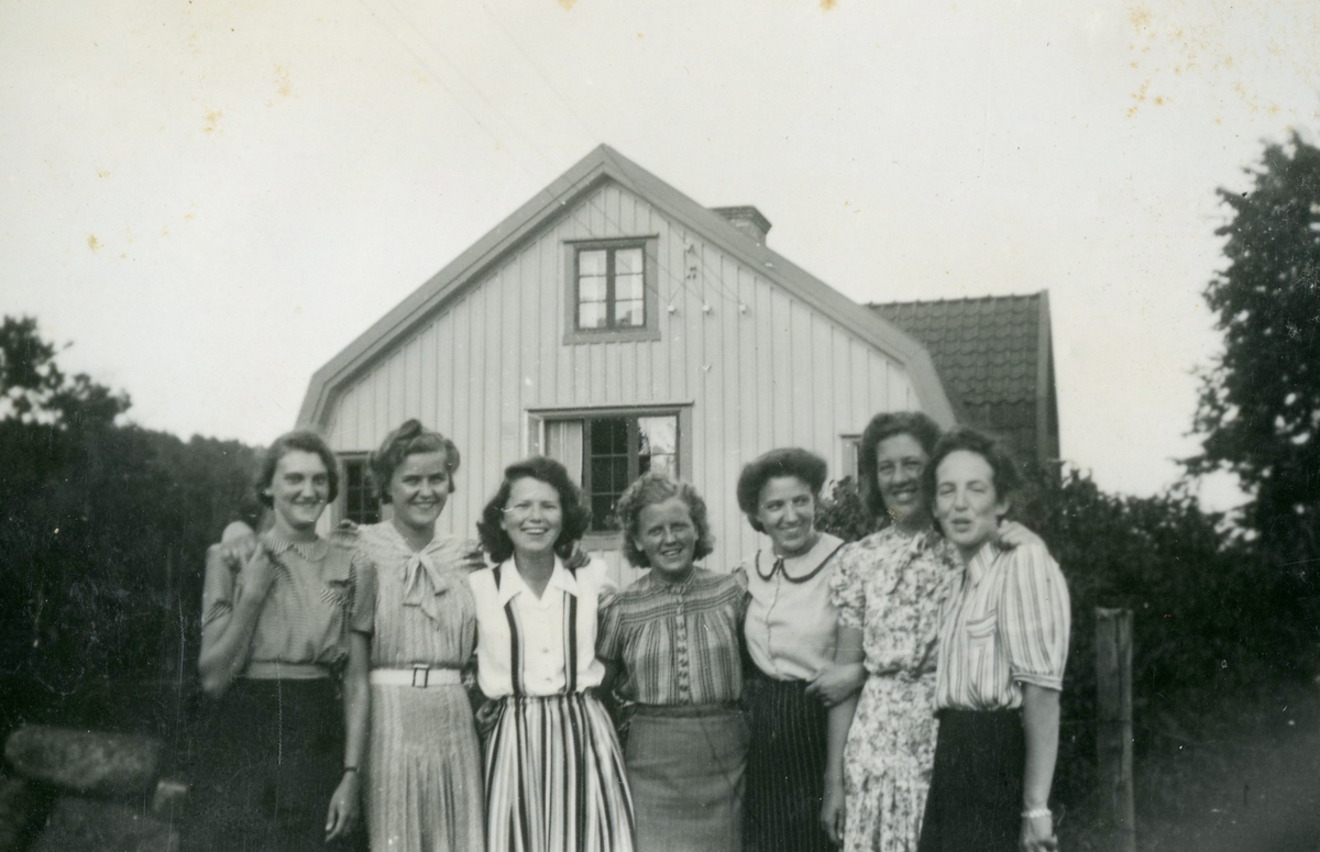 Sju unga kvinnor står utanför Rothwalls villa (Streteredsvägen 31) i Vommedal, tidigt 1940-tal. Kvinnorna är fotografens väninnor, företrädesvis från Partille. Från vänster: 1. Rut Lind. 2. Nellie Gustafsson-Kullbring. Övriga okända.