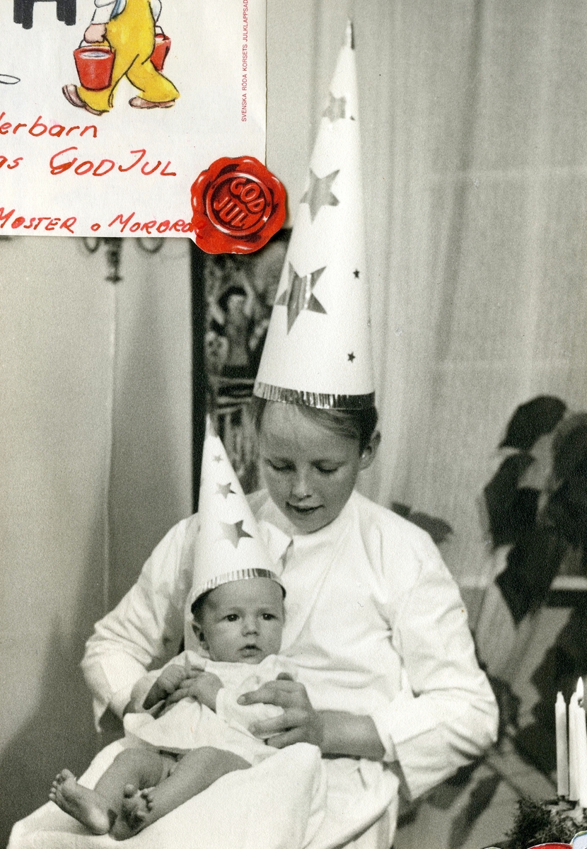 Luciafirande hos Rothwalls i Kållered 1955. Storebror Svante Ekman, iklädd stjärngossekläder, sitter med lillebror Manne i sitt knä. Relaterat motiv: A2864.