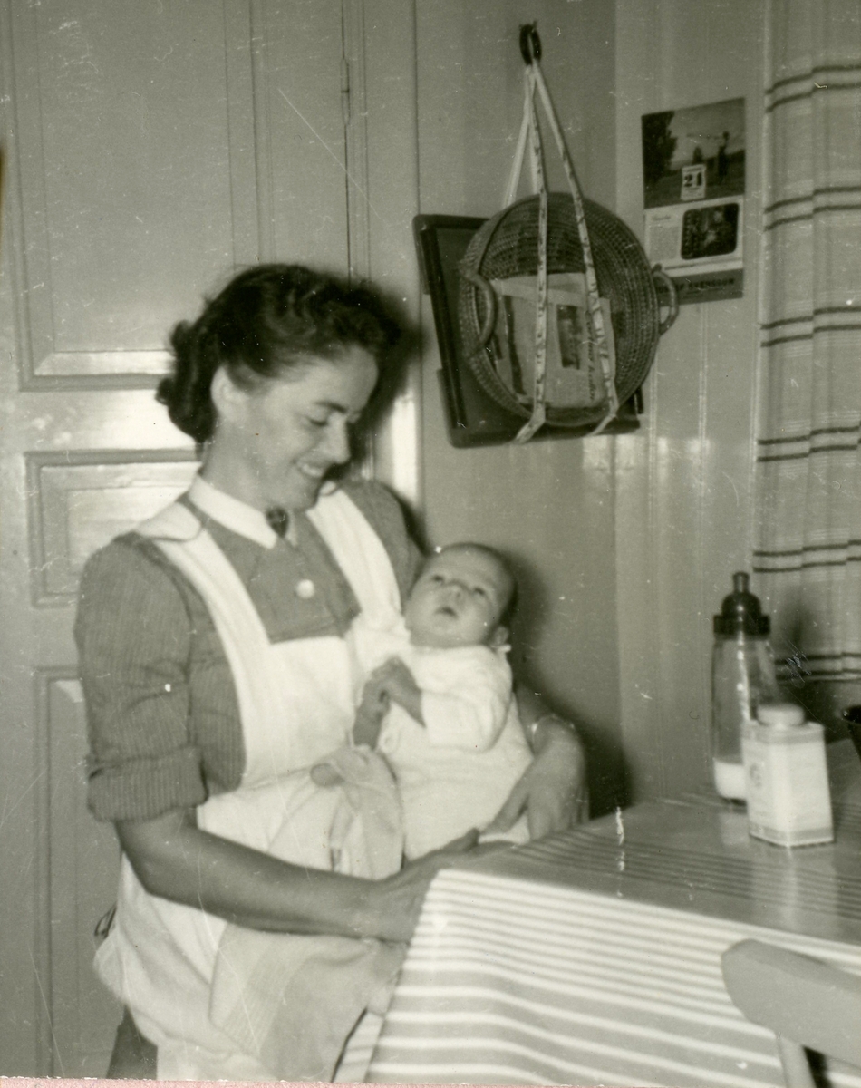 Hemsyster Signe Wahlberg är på besök och håller lille Manne Ekman (född 1955-09-23) i sin famn, Rothwalls i Kållered 1955.