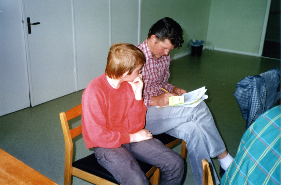 Repetition inför Bygdespelet "Brandskatten" i Kållereds Kommunalhus (Streteredsvägen 3) cirka 1986/87. Spelmannen Sven-Åke Svensson från Lindome Hembygdsgille sitter med sonen Magnus och noterar i sitt manus.
