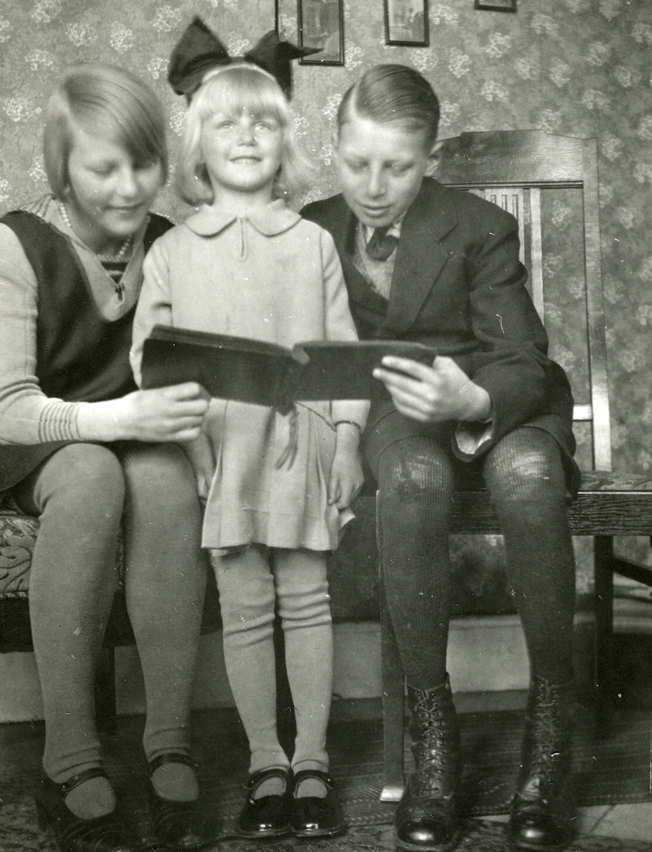Syskonen Pamp i Stretereds personalbostad, okänd årtal. Från vänster: Gertrud Pamp (född 1917), Karin (1923 - 1993) och Bertil (1915 - 1952). De var barn till Hjalmar Pamp (född 1890 i Danmark, död 1926 i Kållered) och Olga* Ellen Alma Maria Pamp (1890 - 1968). Hjalmar var trädgårdsmästare vid Stretereds skolhem. Familjen kom till Stretered år 1921 och bodde då i personalbostäderna vid Tulebosjön. Efter makens död flyttade änkan med barnen till Kvibille år 1927. Relaterat motiv: A2261.