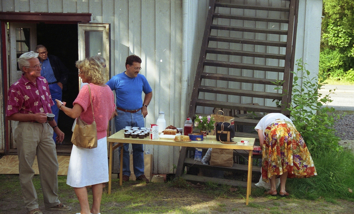 Invigning av Ekebackens Hantverksgård (tidigare John Lindströms möbelsnickeri) på Gamla Riksvägen 81, början av 1990-talet. Besökare står samlade utanför entrén. Staffan Bjerrhede står tredje person från vänster.