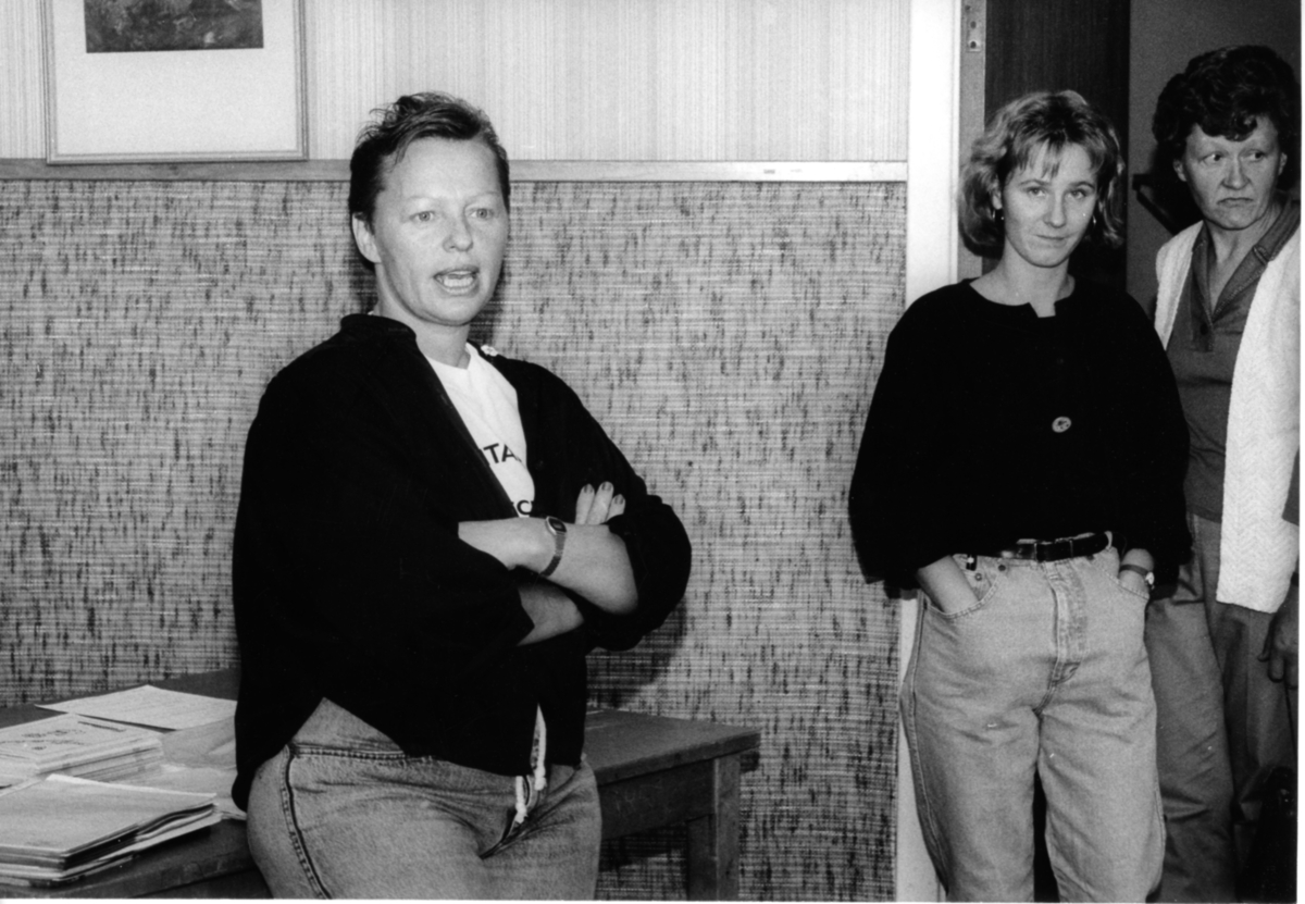 Repetition pågår inför Bygdespelet "Brandskatten" i Kållereds Kommunalhus (Streteredsvägen 3), cirka 1986/87. Från vänster: Okänd kvinna, Eva Ågren (projektansvarig från Studieförbundet Vuxenskolan) samt dräktansvarig Greta Nilsson från Lindome.