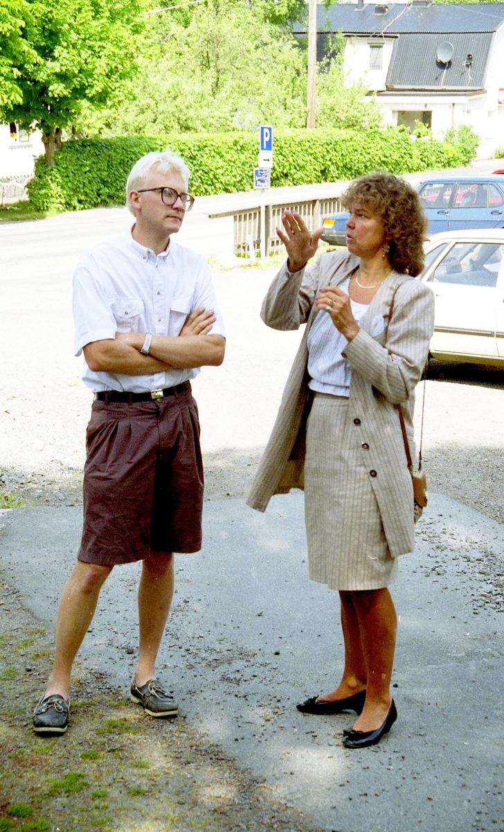 Invigning av Ekebackens Hantverksgård (tidigare John Lindströms möbelsnickeri) på Gamla Riksvägen 81, början av 1990-talet. Från vänster: Anders Oskarsson (gårdens ägare) samt en kvinnlig representant från Medborgarskolan.