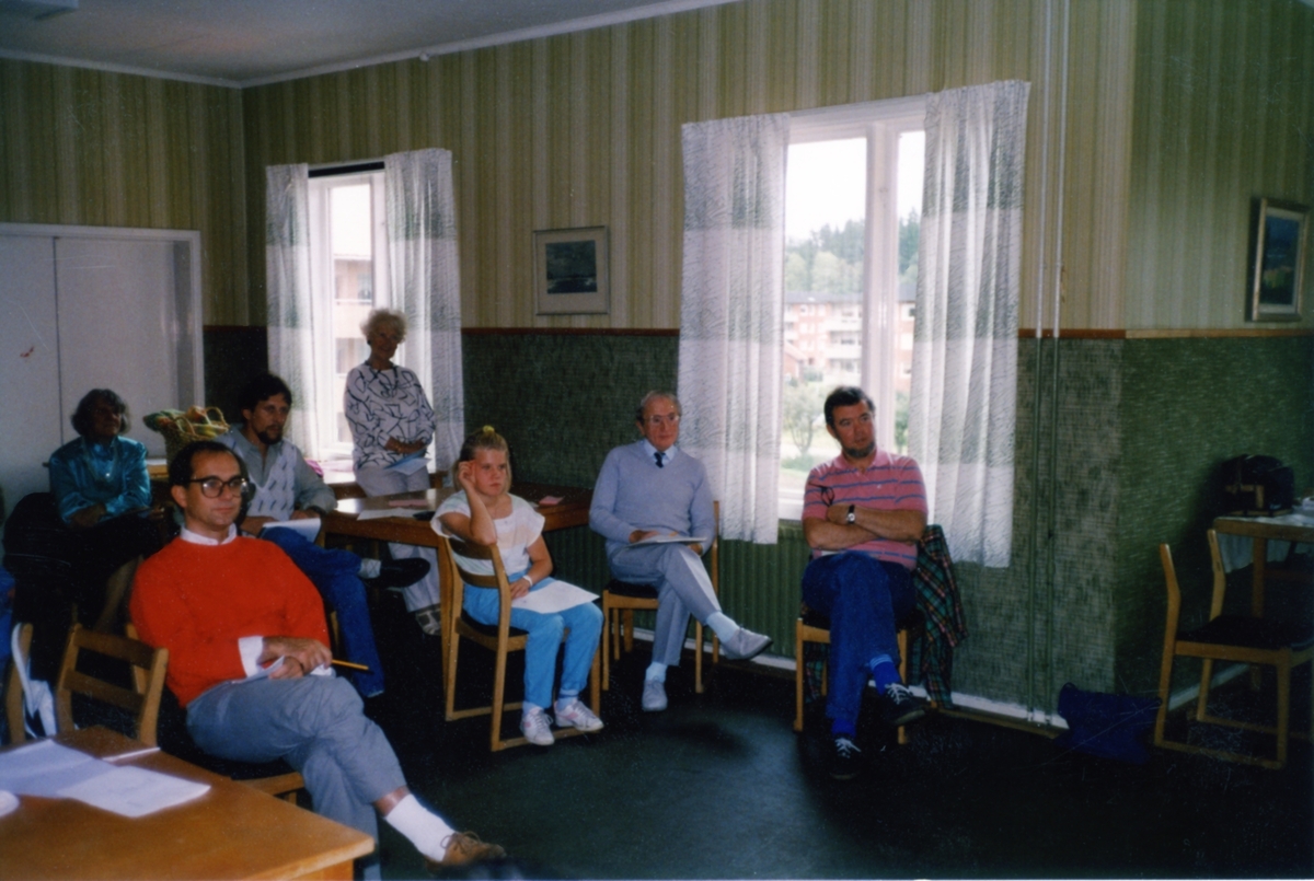 Manusgenomgång inför Bygdespelet "Brandskatten" i A-salen, Kållereds Kommunalhus (Streteredsvägen 3) 1986/87. Sittande från vänster: (i röd tröja) Åke Persson, (i grå tröja) Albert Eklund, (i randig tröja) okänd man som spelade huvudrollen. Relaterade motiv: A3186 - A3251.