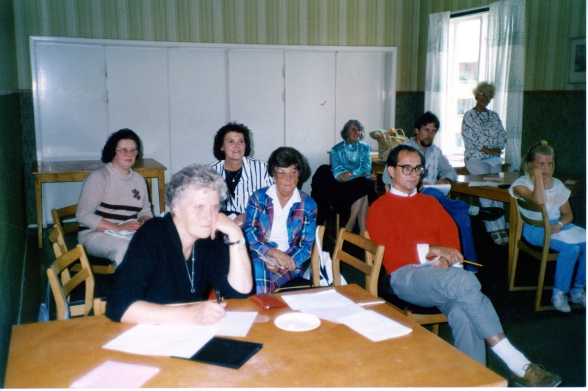 Repetition inför Bygdespelet "Brandskatten", A-salen i Kållereds Kommunalhus (Streteredsvägen 3) 1986/87. Från vänster: 1. (bakre raden) Viola Karlsson, Kållered. 2. (främst sittande vid bordet) Lily Edvardsson, Kållered Hembygdsgille. 3. (man i röd tröja och glasögon) Åke Persson, Centerpartiet. Övriga namnuppgifter saknas.