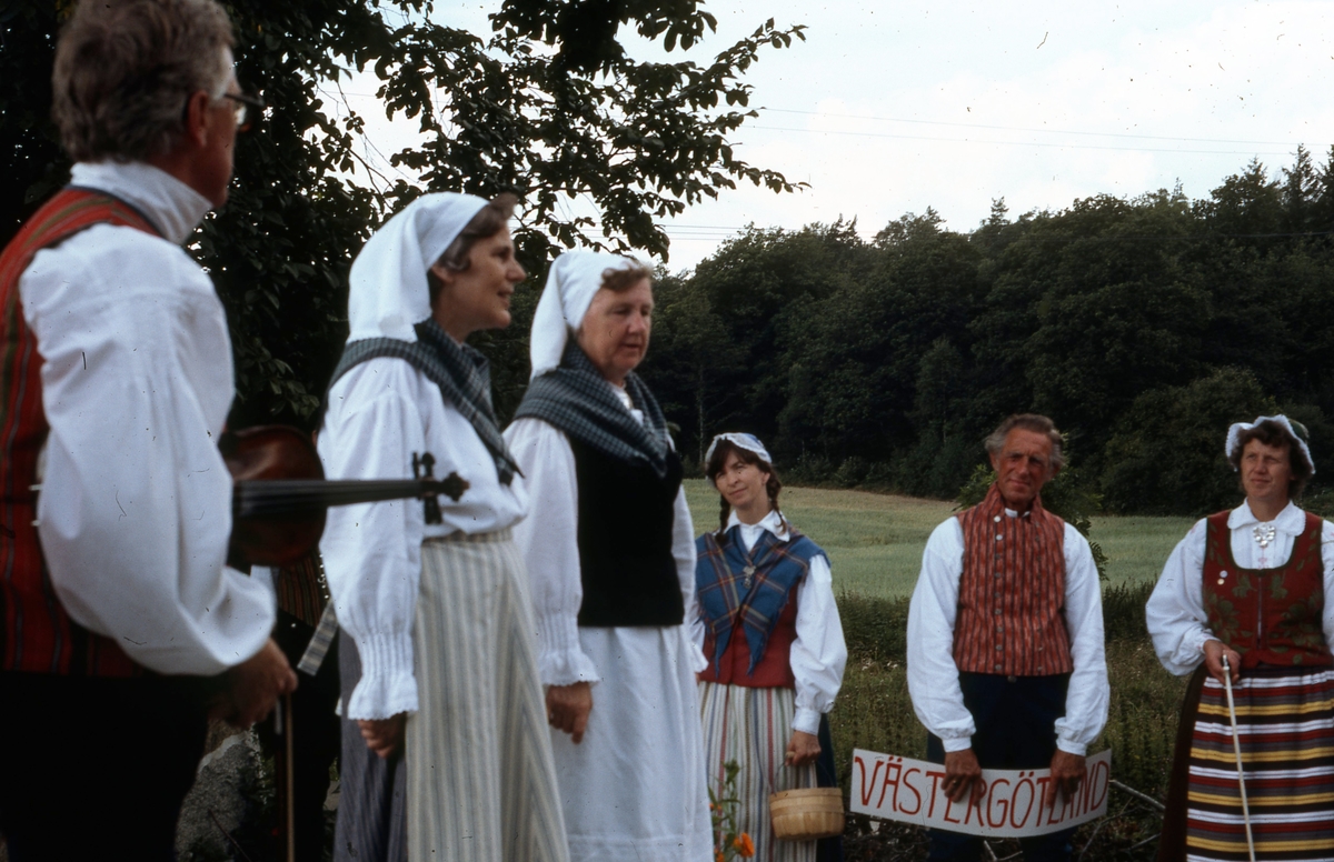 Dräktparad med folkdräktsklädda män och kvinnor en hembygdsdag på Långåker år 1984. Från vänster: 1. Okänd, 2. Solveig Olsson i Mölndalsdräkt (Mölndal Hbf), 3. IngaBritt Asplund i Mölndalsdräkt, 4. Okänd, 5. Henrik Lundell Västergötlandsklädd, 6. Deltagare från Hällesåkers spelmanslag.