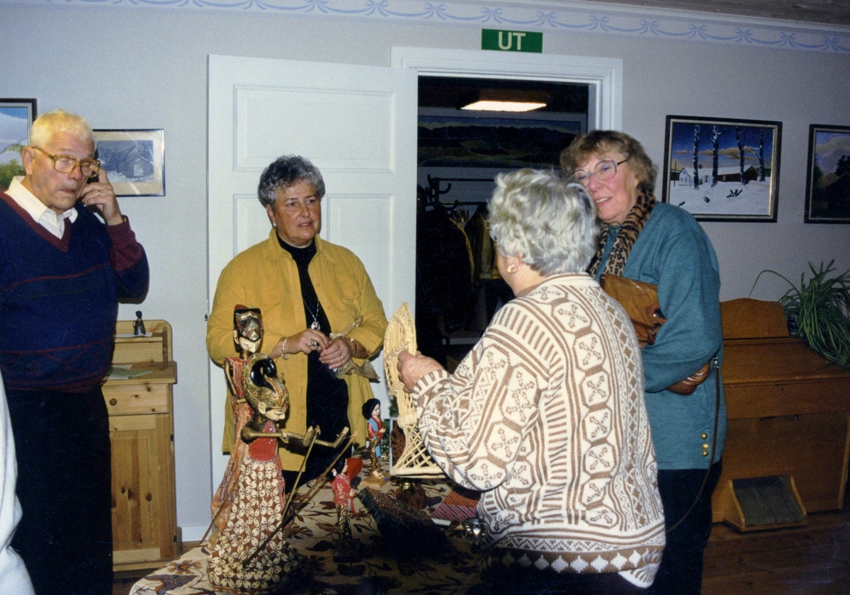 Indonesiskt föredrag av Gun Flygare i Hembygdsgården Långåker 1:3, 1990-tal. Från vänster: 1. Erik Mattsson, Bölet, 2. Gun Flygare som har bott några år i Indonesien, 3. Eivor Bjerrhede (ryggen åt kameran) samt 4. Solveig Mattsson, Bölet. Relaterat motiv: A2938.
