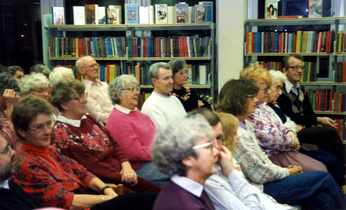 Kulturarrangemang i Kållereds bibliotek, 1990-tal. Andra rad från vänster: Karin Gustafsson, Gördis Johansson samt Eivor Bjerrhede. Första rad: bland annat Gunvor Olsson, Hulda Olsson samt Bengt Olof Olsson. Övriga är okända.