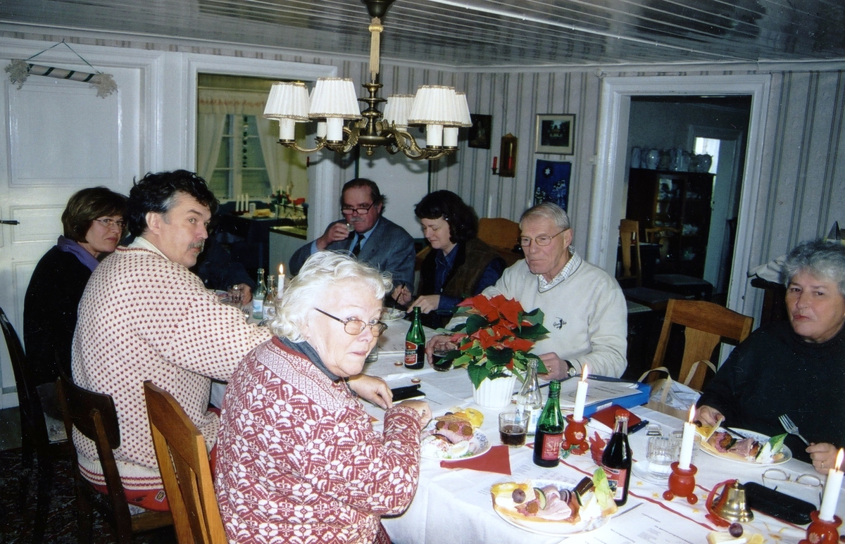 Styrelsemöte och julavslutning för Kållered Hembygdsgille i Vommedal Västergård, 1990-tal. Från vänster: Gun Paterson, Manne Ekman och Solveig Warvås. Höger sida bakifrån: Tomas Söderberg, Ingela Nilsson Torvaldsson, Rolf Bäckman och Gun Flygare.