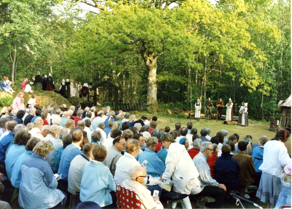 Första sommaren för Bygdespelet "Brandskatten", Ekansås i Kållered år 1987. Skådespelarna och spelmännen är klädda i tidstypiska dräkter. I publiken sitter bland annat: Annika Bjerrhede, fadern Thure Bjerrhede, Hans Lundin samt Karin och Berny Gustafsson.