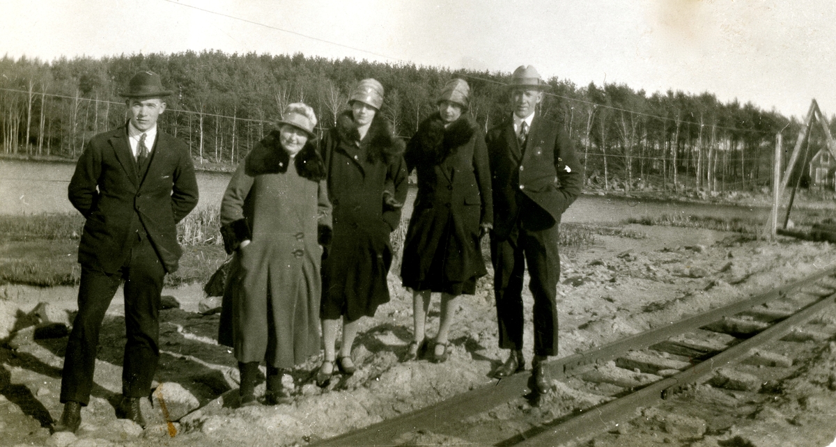 Fem personer från Kållereds stom "Nygård" står vid järnvägen, uppklädda i finkläder och hatt. De är på besök vid omläggningen av Västkustbanan, Sagsjön 1925 - 1930. Från vänster: Busschaufför John Johansson, Backen (1898 - 1966), svärmor Karolina Gustafsson (1873 - 1949), Ingeborg Gustavsson (1901 - 1987, gift Johansson), systern Astrid Gustavsson (1907 - 1994, gift Jägerström) och Stig Jägerström (1903 - 1977).
