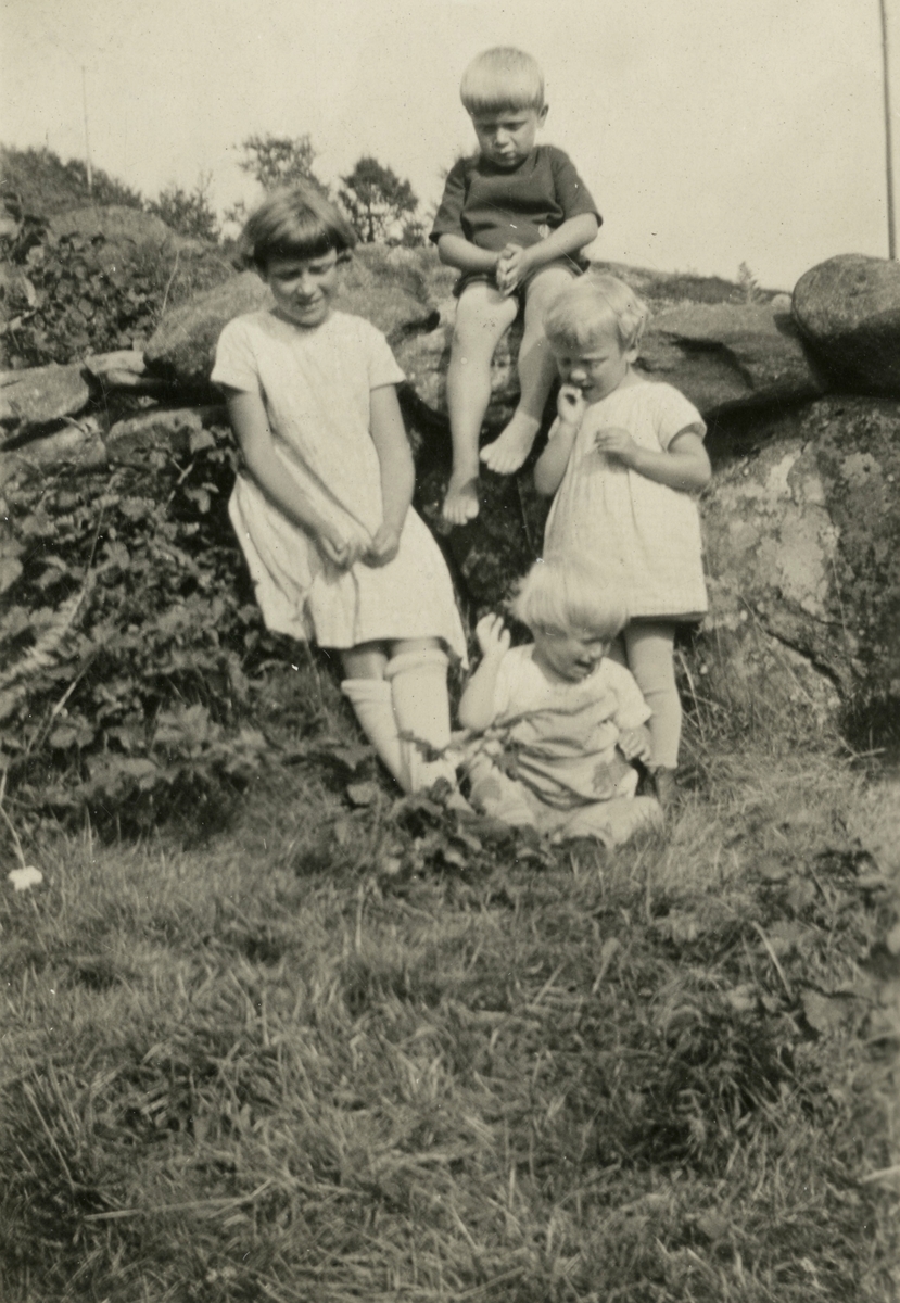 Fyra små barn sitter i en sluttning, Vommedal Östergård cirka 1930. Från vänster: 1. Rut Johansson Sandberg (1921 - 1971). 2. Frank Efraimsson (1925 - 1997. 3. Ingegärd Johansson Månsson (1924 - 1976). 4. Okänt litet barn. Rut och Ingegärd är syskon samt barn till Gustav och Judit Johansson, Vommedal Östergård "Olas". Frank är son till Anna och Vitalis Efraimsson samt kusin till Rut och Ingegärd.