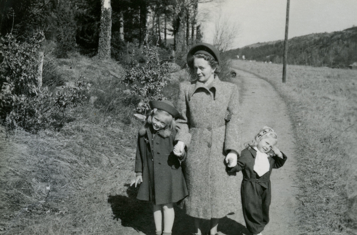 Rosa Pettersson (1912 - 1994) och döttrarna Eva (född 1944, gift Kempe) samt Karin (född 1947, gift Hansson) promenerar på "Hernkvistens väg" år 1950. Det var en väg som gick från Kållereds centrum (Gamla Riksvägen) över Kärret (innan motorvägen byggdes) till Torrekulla. Vägen kallades "Hernkvistens väg" efter en familj som ägde en gård vid nuvarande Märgelvägen.