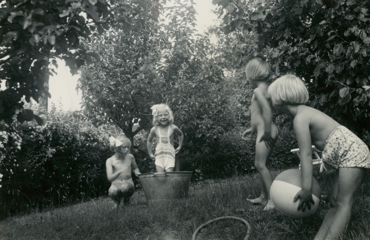 Fyra små flickor leker i familjen Petterssons trädgård på Gamlehagsvägen 17 i Torrekulla, år 1951. Från vänster: systrarna Eva (född 1944) och Karin Pettersson (född 1947) samt systrarna Monica och Lena Börjesson, döttrar till Britta (1919 - 1963) och Gunnar Börjesson (1916 - 1992) från Trollåsen i Torrekulla.
