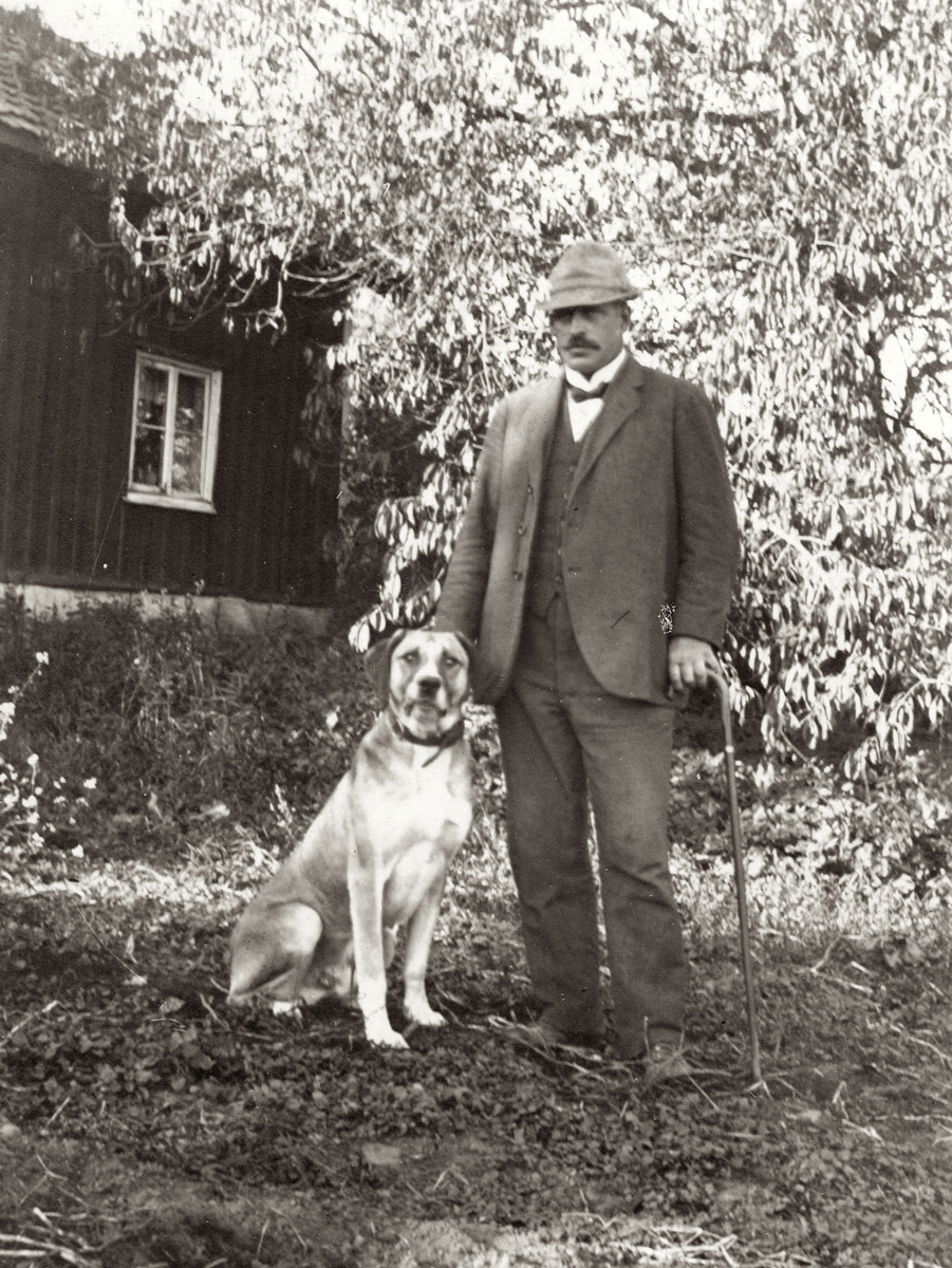 Trädgårdsmästare Johan Gustaf Johansson Scotte ståendes med en hund i en trädgård (troligtvis personalbostaden "Trädgårdsvillan"), Stretered år 1921. Johan Gustaf Johansson Scotte (född 1876 i Revesjö, Svenljunga, död 1949 i Kungsbacka) arbetade vid Stretereds skolhem.