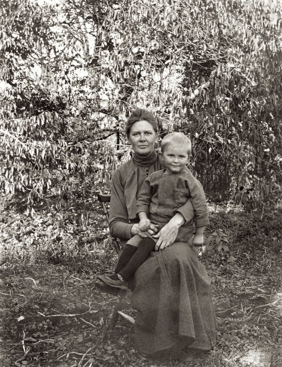 Klara Scotte (1875 - 1962 i Kungsbacka) sitter i en trädgård hållandes sonen Helmer (1918 - 2008 i Upplands Väsby) i knät, Stretered okänt årtal. Klara var gift med trädgårdsmästare Johan Gustaf Johansson Scotte (född 1876 i Revesjö, Svenljunga, död 1949 i Kungsbacka) som arbetade vid Stretereds skolhem.