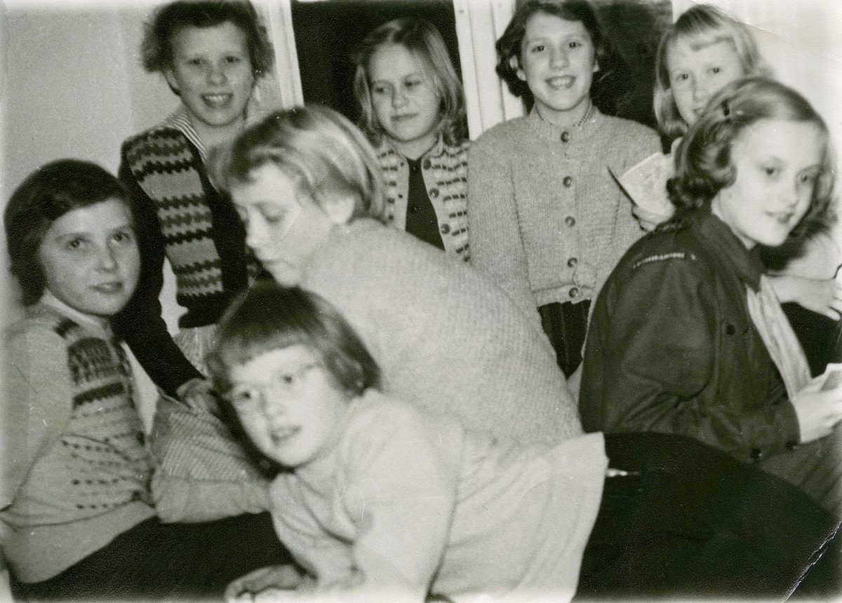 Scoutmöte med ungdomar i Brattbergs källare (en villa i Kyrkbacken) år 1952. Längst bak från vänster: 1. Eivor Brattberg, 2. Mona Brattberg, 3. Solveig Svensson Storfors (Vommedal) och 4. Agneta Larsson (Stretered).