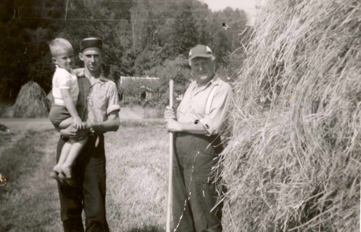 Bröderna Stellan (född 1955, Vommedal Västergård) och Lennart Svensson (född 1944, Vommedal Västergård) samt Gustav Bengtsson (1893 - 1979) år 1957. De står vid Vommedal Västergård 3:6 "Tildas" (Mathilda Karlssons) som ses i bakgrunden. Gustav ägde gården Vommedal Västergård 3:3 "Hanses". Fotot är ungefär vid Vommedalsvägen, vid Församlingshemmet.