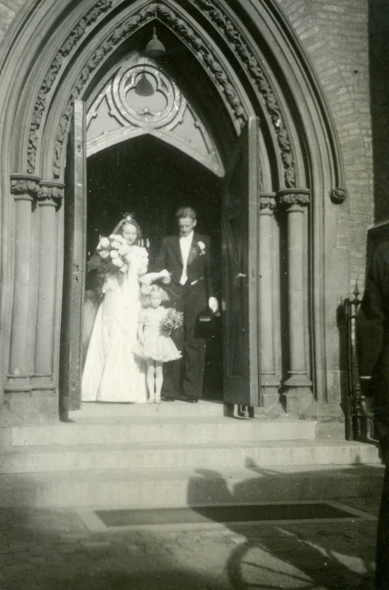Bröllop mellan Mary Ekdahl (1920 - 1988, gift Ekman) och Björn Ekman (1913 - 1992), Hagakyrkan i Göteborg 1941-06-07. Paret står i ett valv på väg ut ur kyrkan. Tärnan är okänd.