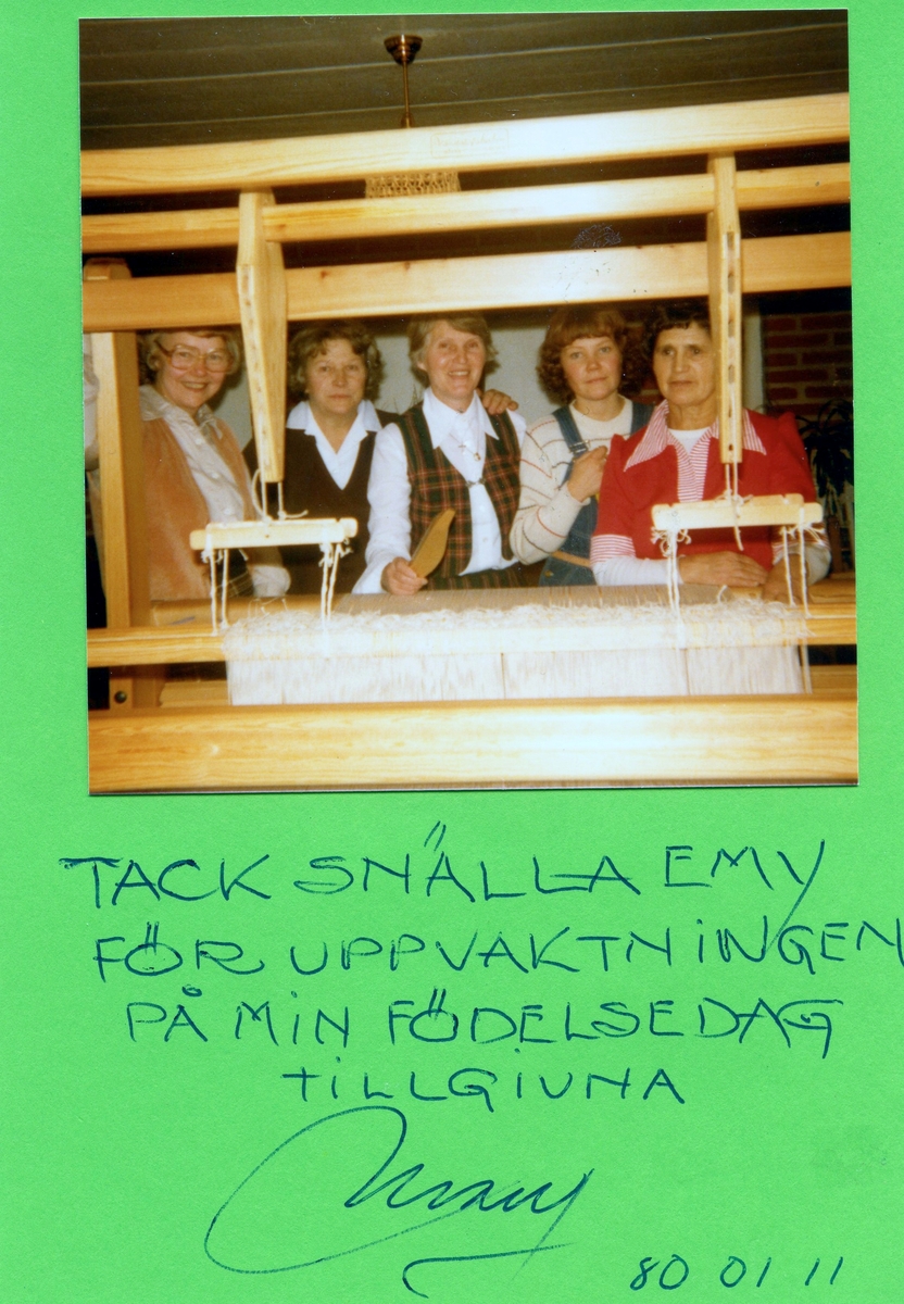 Tackkort till hembygdskommittén från Mary Ekman, 1980-01-11. "Tack snälla Emy för uppvaktningen på min födelsedag, tillgivna Mary". Från vänster: 1. Ingegärd Benkel, 2. Gunhild Melin, 3. Emy Johansson, 4. Lena Lindgren och 5. Dagmar Svensson.