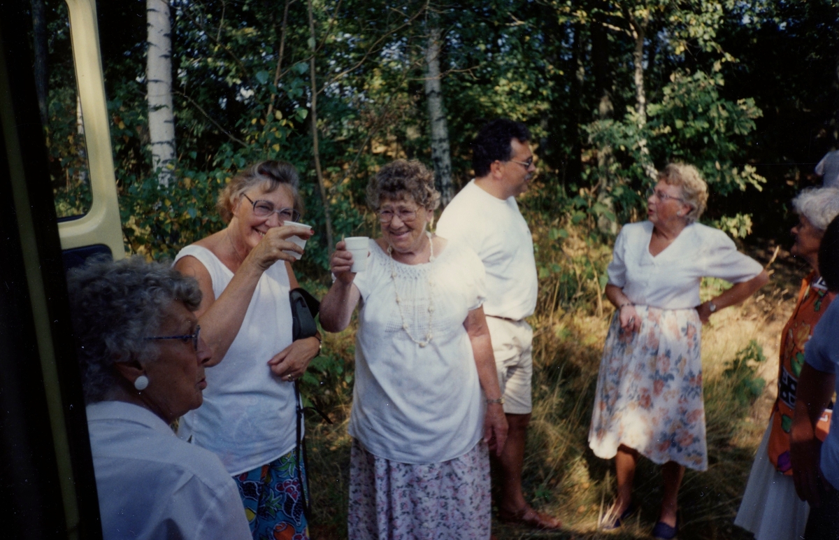 Brattåsgårdens äldreboende besöker Hembygdsgården Långåker, 1990-tal. Det är i samband med avslutning av en SV Studiecirkel* på Brattåsgården ihop med Hembygdsgillet. Från vänster: 1. Stina Svensson, 2. Solveig Matsson, 3. Gördis Johansson, 4. guide Staffan Bjerrhede, 5. Majken Olsson, 6. Nancy Ehrenborg. Relaterat motiv: A2114.