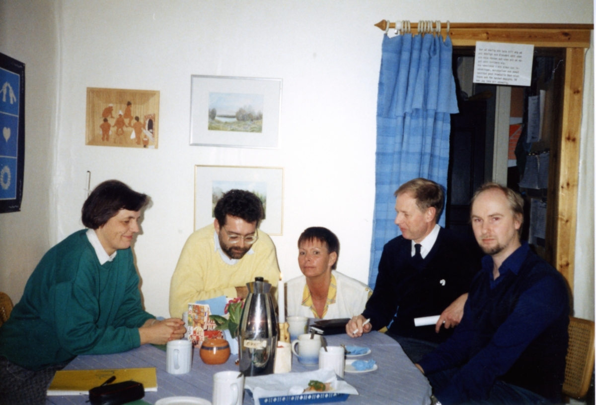 Fem personer sitter vid ett bord i Studieförbundet Vuxenskolans lokal i Dr Björcks villa på Frölundagatan 25 B i Mölndal 1986/87, De är samlade med anledning av förberedelser inför Bygdespelet "Brandskatten" som visades på Ekansås i Kållered sommaren 1987. Från vänster: 1. Christina Rydh, kultursekreterare Mölndals Stad. 2. Staffan Bjerrhede, SV Mölndal. 3. Ingvor Lagermark, SV Mölndal. 4. Rolf Abrahamsson, Kvarnbyn Folkdanslag. 5. Håkan Mattsson, Lindome Hembygdsgille, som tog fram det historiska underlaget. Relaterat motiv: A3248.