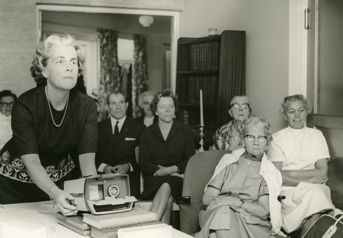 Diabildsvisning av Märta Lindman i matsalen på Brattåshemmets ålderdomshem, 1960-tal. Från vänster: 1. (i bakgrunden) Okänd kvinna, 2. Märta Lindman, 3. socialnämndens ordförande Gustaf Eklund (Sagered), 4. föreståndare Magda Andreasson "Syster Magda", 5. Ulla Eklund (Sagered) från socialnämnden, 6. Olga Holmén (1887 - 1978, Vommedal), 7. Berta Börjesson (1889 - 1967, Lugnet) samt 8. ett biträde.