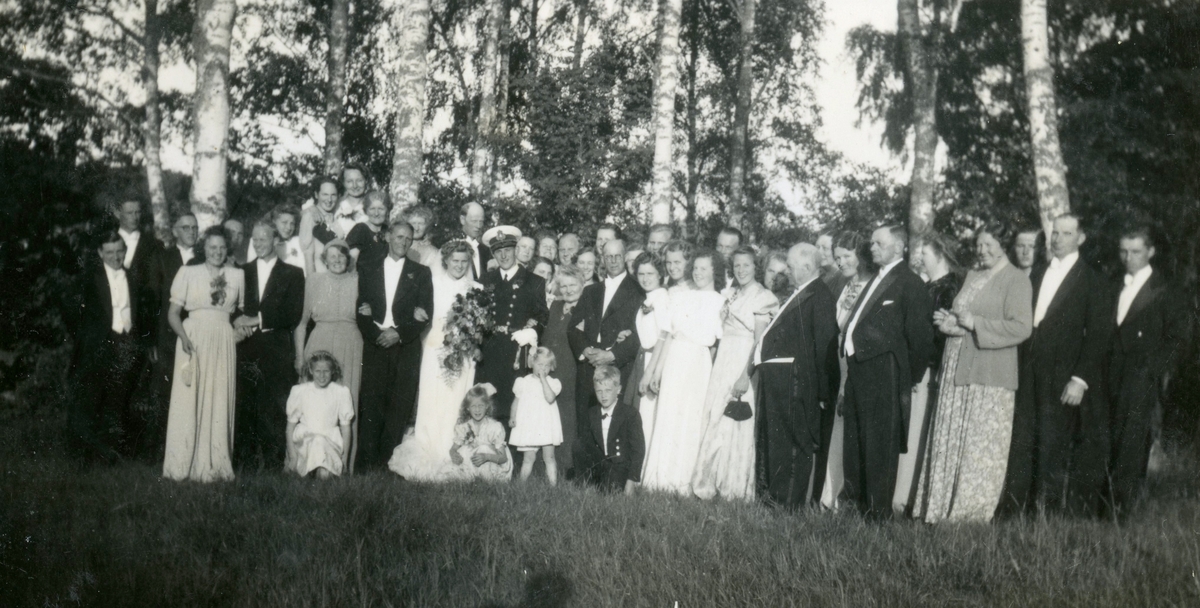 Bröllop mellan Nellie Gustafsson (1919 - 1993) och Eivind "Eje" Kullbring (1918 - 1996) som vigdes i Kållereds kyrka 1942-06-23. Brudparets släktingar och vänner står samlade utanför Fridhem (vid nuvarande Ekenkyrkan på Heljeredsvägen/Labackavägen), som var Nellis föräldrarhem. Hennes föräldrar var Rut och Anders Gustafsson. Eivinds föräldrar var Eira och Douglas Kullbring.