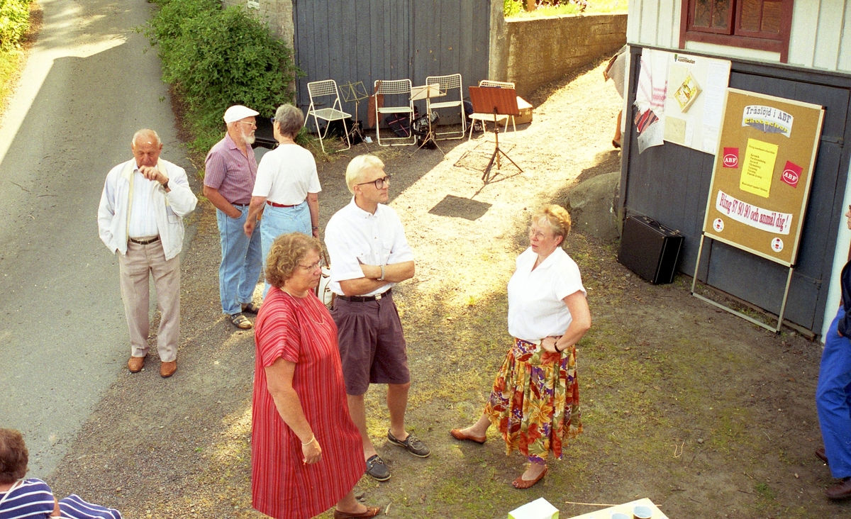 Invigning av Ekebackens Hantverksgård (tidigare John Lindströms möbelsnickeri) på Gamla Riksvägen 81, början av 1990-talet. Från vänster: 1. Knut Sund, 2. Karl Werner, 3. Maj Werner, 4. Ingrid Duwe (ABF, i röd klänning), 5. Anders Oskarsson (gårdens ägare) samt 6. Eivor Strandefjord (SV).
