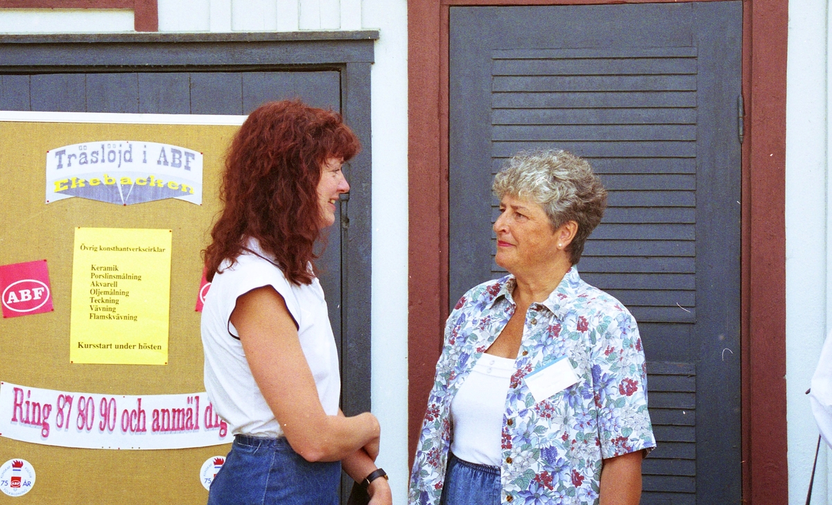 Invigning av Ekebackens Hantverksgård (tidigare John Lindströms möbelsnickeri) på Gamla Riksvägen 81, början av 1990-talet. Marie Berg och Gun Flygare, båda från Vuxenskolan, samtalar. På dörren till vänster ses skyltarna "Träslöjd i ABF Ekebacken" samt "Ring 87 80 90 och anmäl dig!"